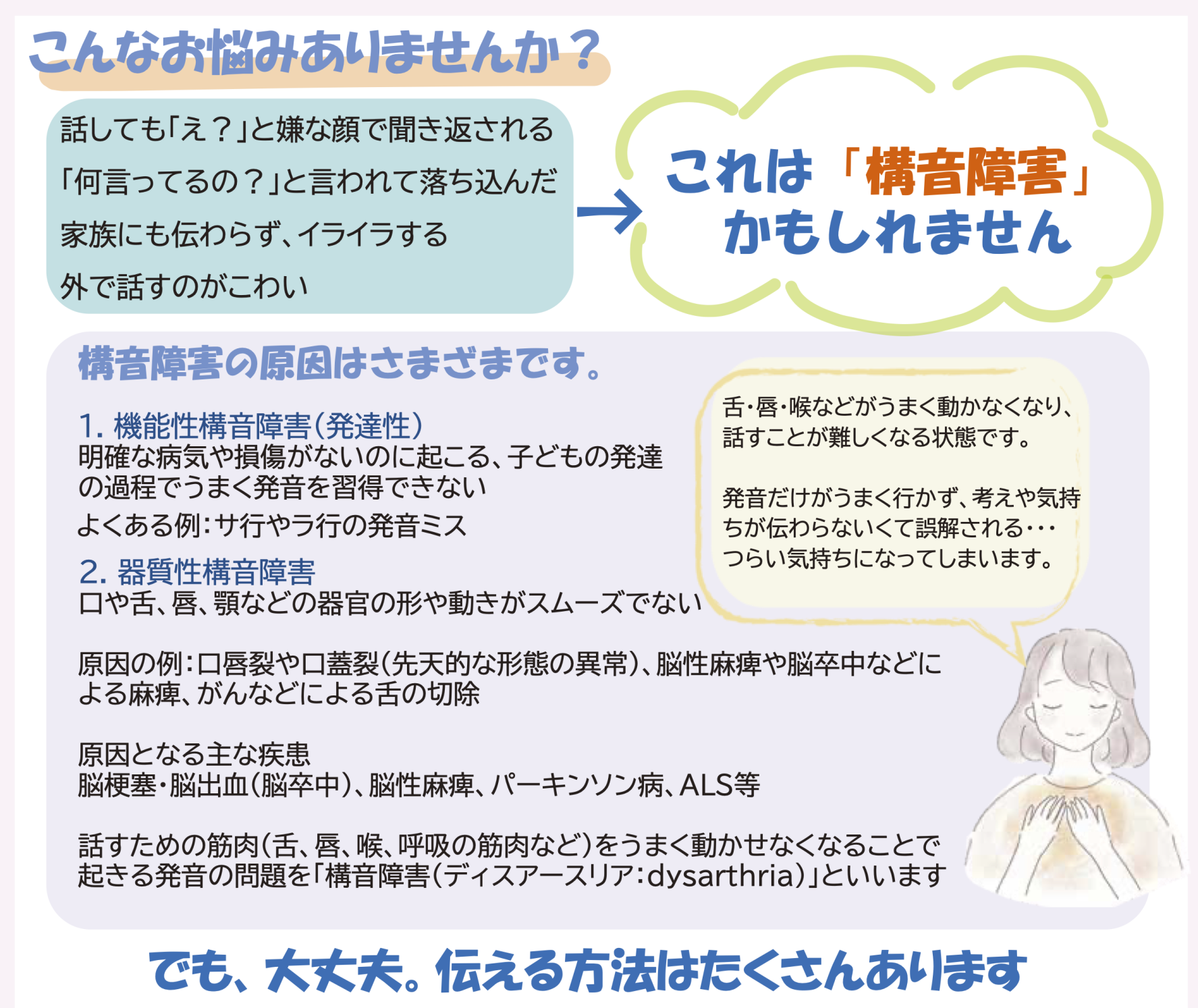 新着情報日本構音障害協会の新しいチラシができました。古本 由美子さんが作ってくださいました。素敵なチラシありがとうございます!